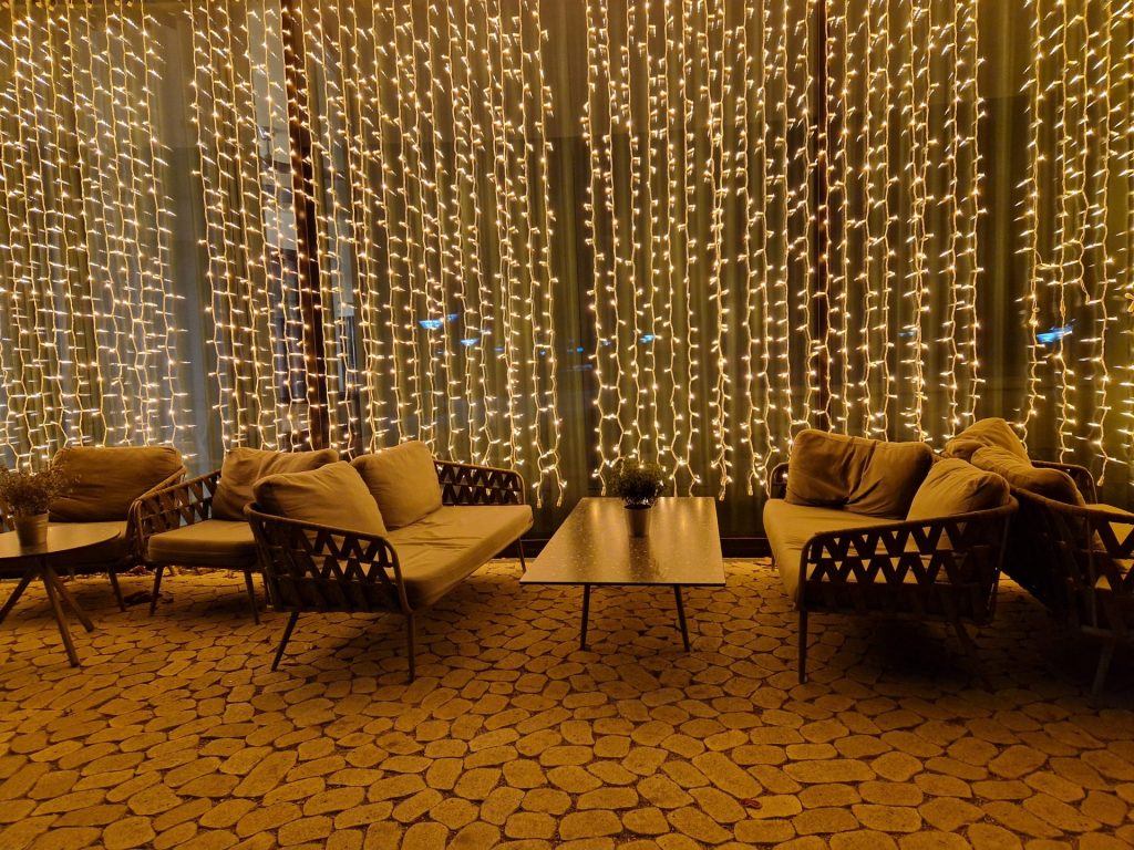 Retro Gartenmöbel vor einer Wand aus Lichterketten
