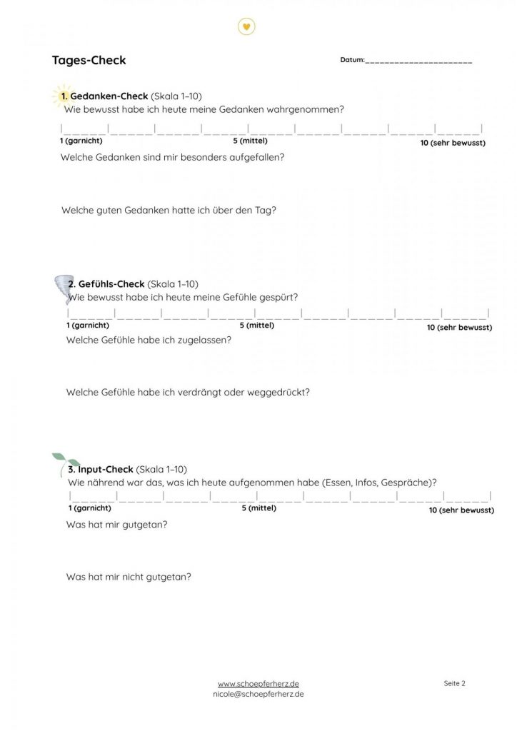- Einen täglichen Check, um deine Gedanken und Gefühle zu reflektieren