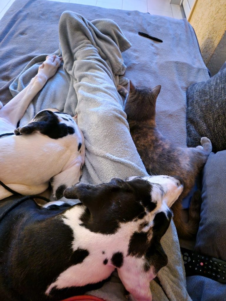 Also übernahm ich das Sitten von zwei Doggen – Marvel und Corona (ja, sie heißt wirklich so). Aber ey, diese Tiere sind krass riesig, aber sowas von herzerweichend! Ständig sind sie an meinen Tisch gekommen und wollten beachtet werden. Abends auf der Couch war ich eingekesselt von den Tieren, und nachts im Bett hatte ich Hundepfoten im Rücken. anstrengend schön.
